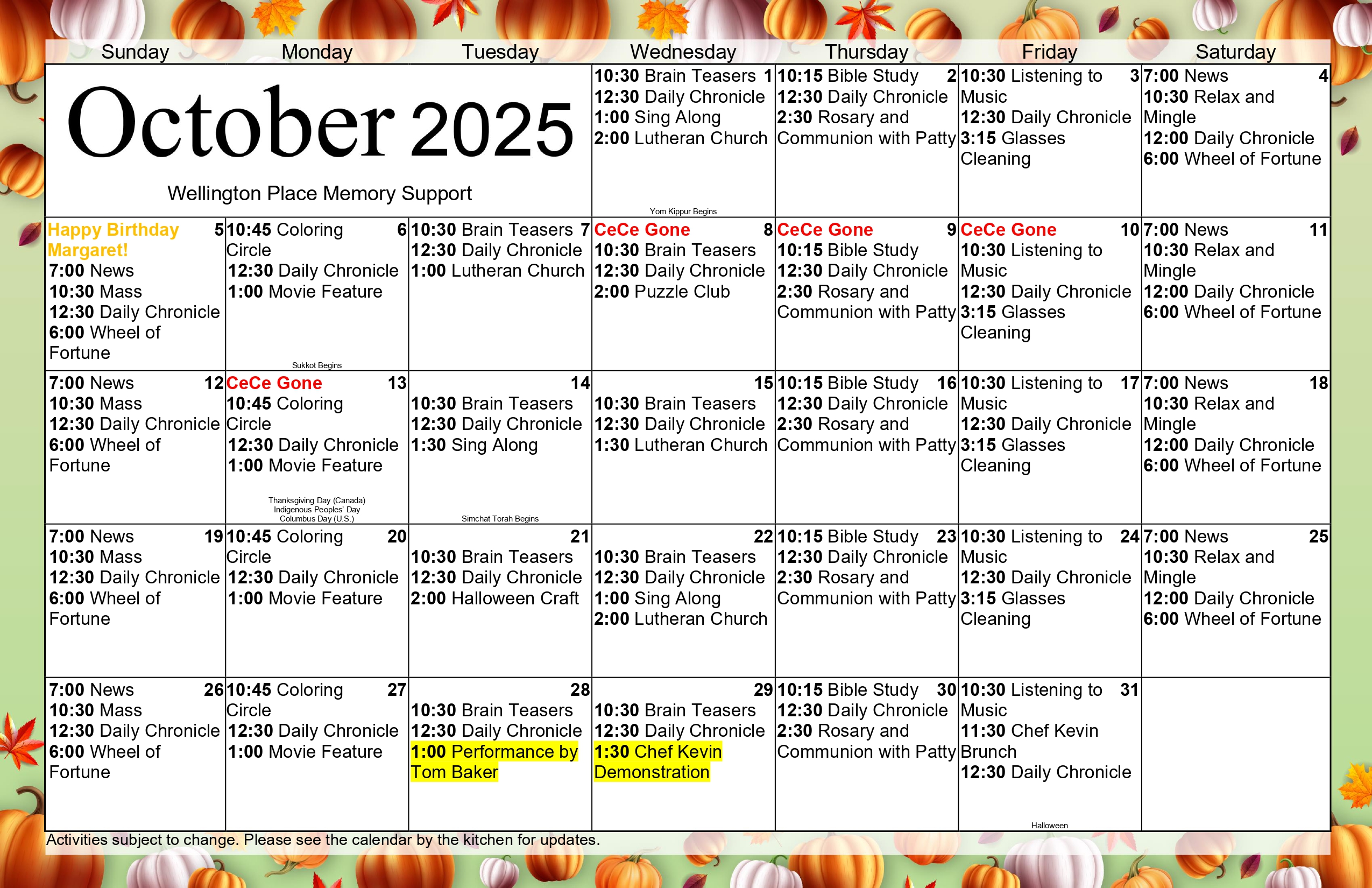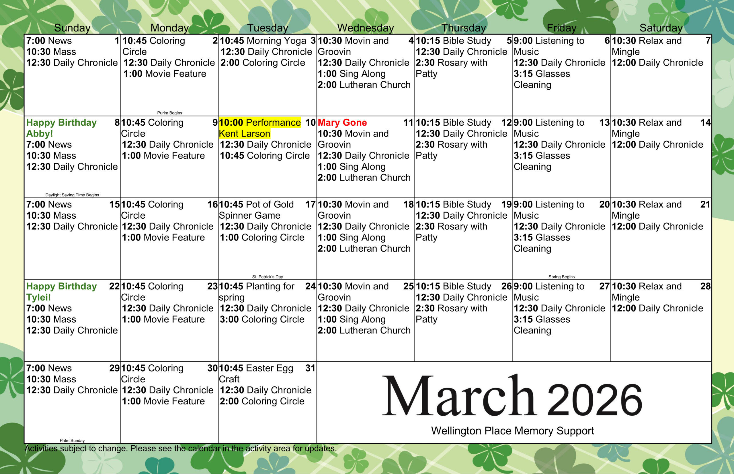 Memory Support Activity Calendar